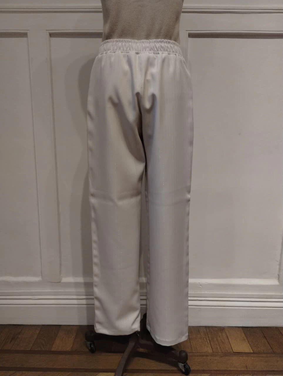 Descubrí el Pantalón Galia, una prenda que combina estilo y comodidad con un corte recto y cintura trasera con elástico para un ajuste perfecto. Confeccionado en una tela con un sutil rayado en foil plateado, aporta un brillo delicado y moderno a tu look.