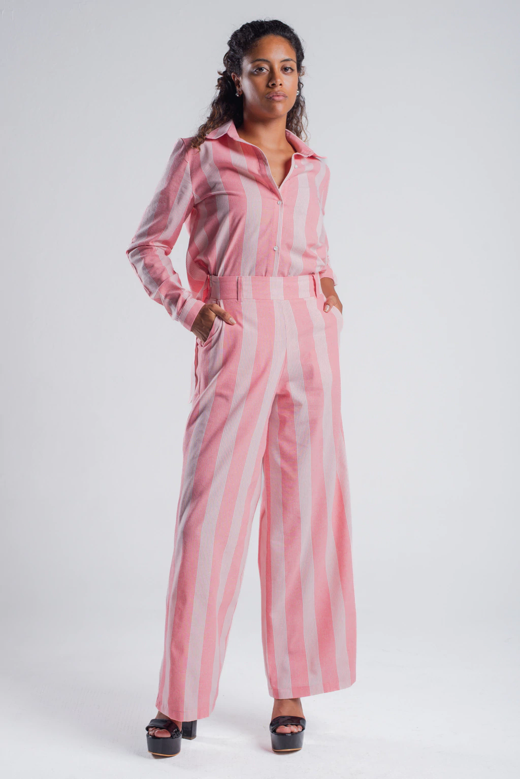 Este palazzo de lino rayado combina estilo y frescura. Su diseño de calce holgado proporcionan un toque moderno y versátil, ideal para cualquier ocasión.