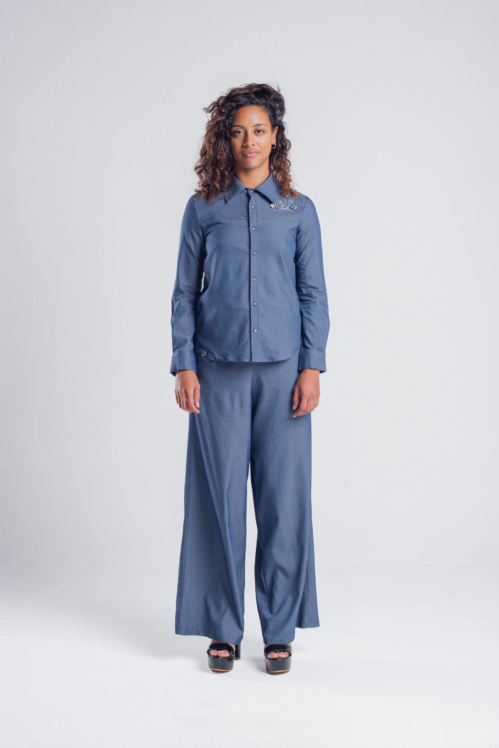 Descubrí el Pantalón Rene, un palazzo de silueta amplia y holgada. Esta prenda combina la textura simil denim con un delicado aplique de strass y piedras sobre el bolsillo delantero, aportando un brillo sutil y elegante. Su diseño único y detalles cuidados la convierten en la opción ideal para lucir sofisticada y cómoda en cualquier ocasión. Perfecta para sumar un toque de distinción a tu guardarropa.